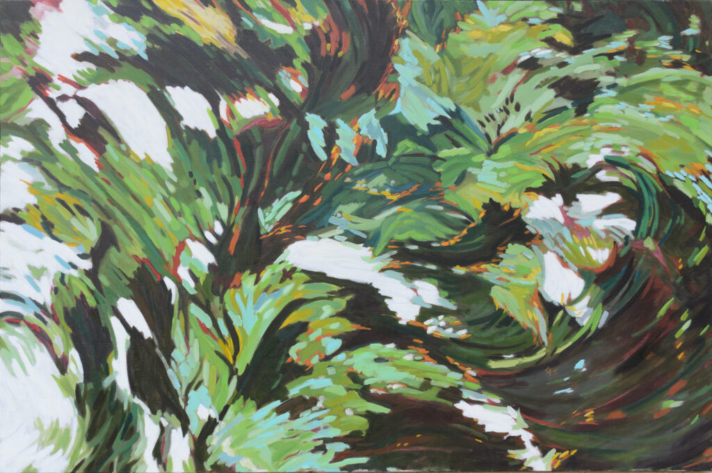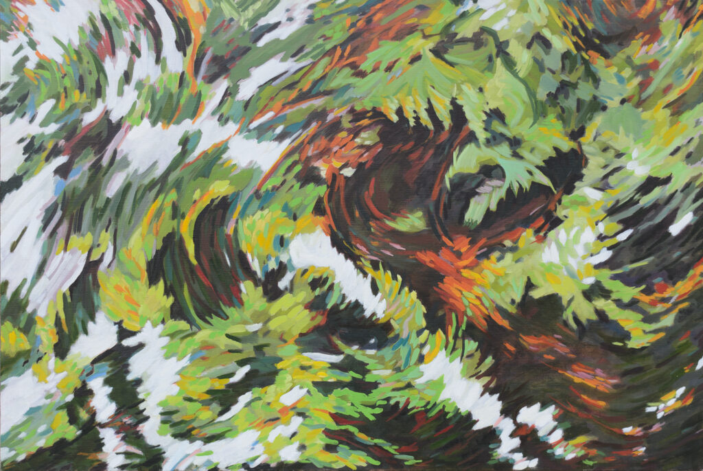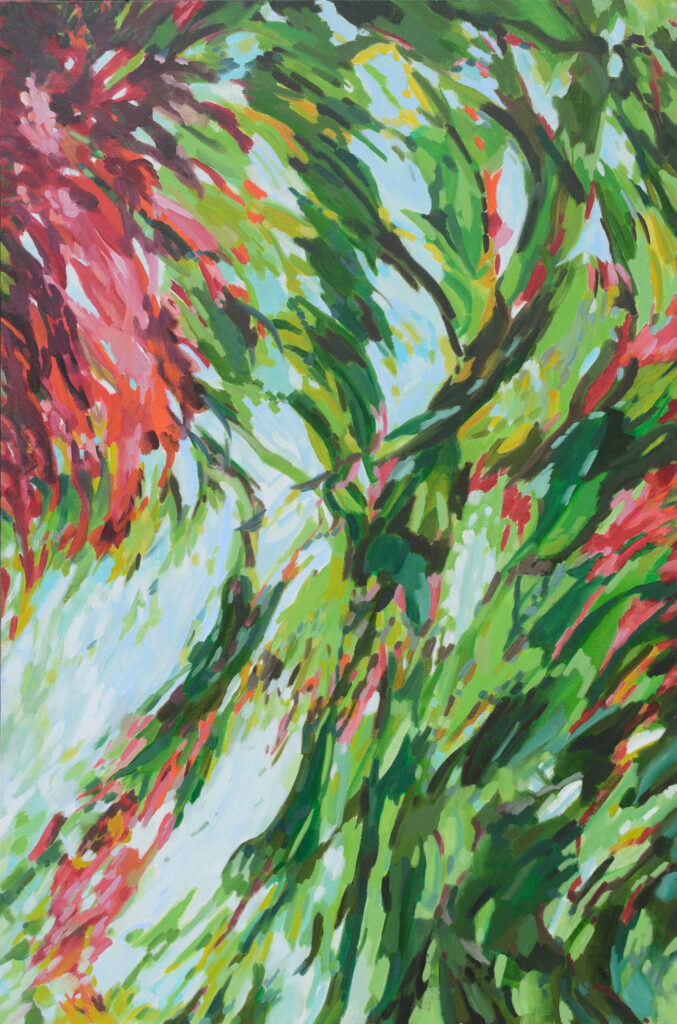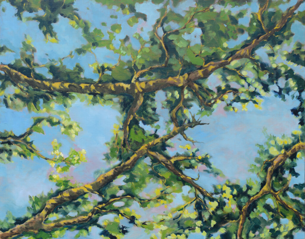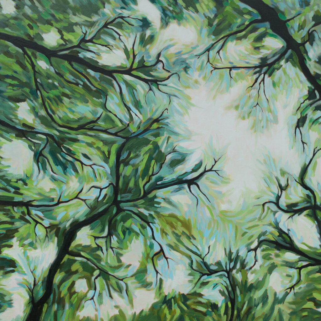 Les ramifications de l’arbre sont tour à tour tortueuses, linéaires, horizontales, verticales. Nues ou feuillues, elles ne sont plus un élément et deviennent un tout.